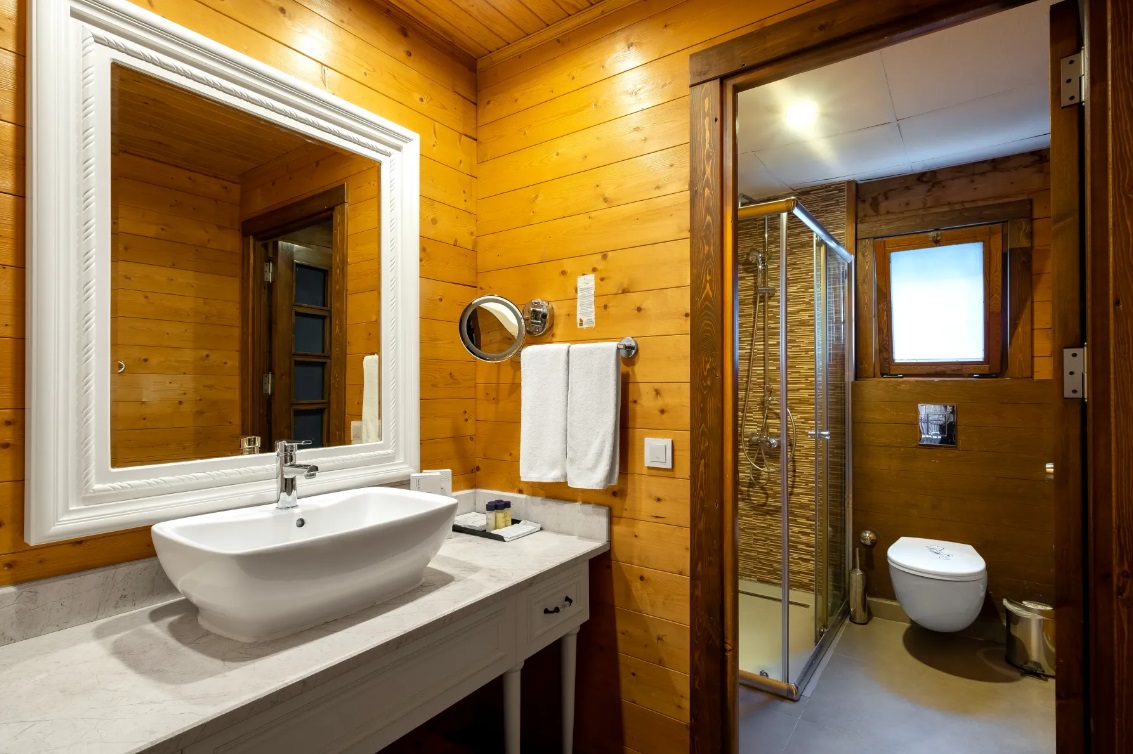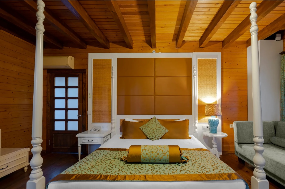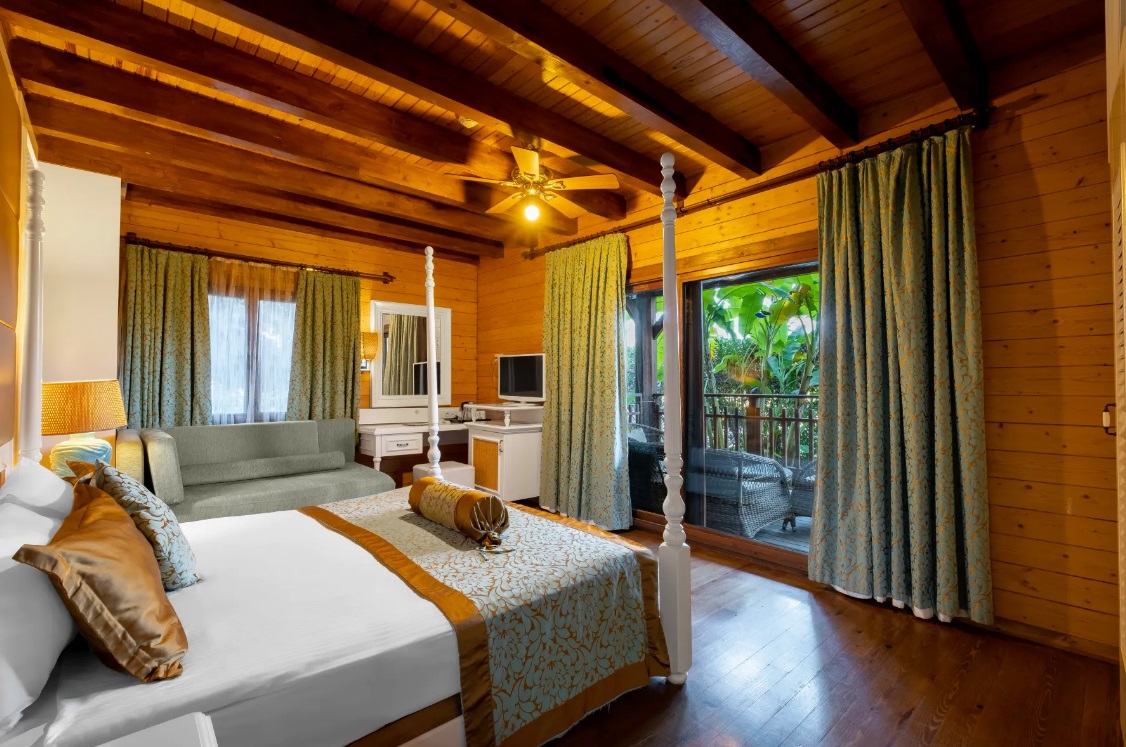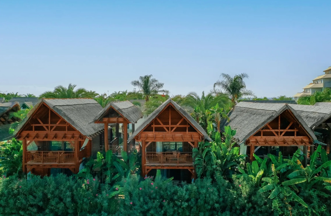 Die Holz-Chalet-Häuser mit Innenausstattung aus Holz, gelegen zwischen Palmen und anderen Pflanzenarten, bieten Ihnen eine naturverbundene Urlaubsmöglichkeit.