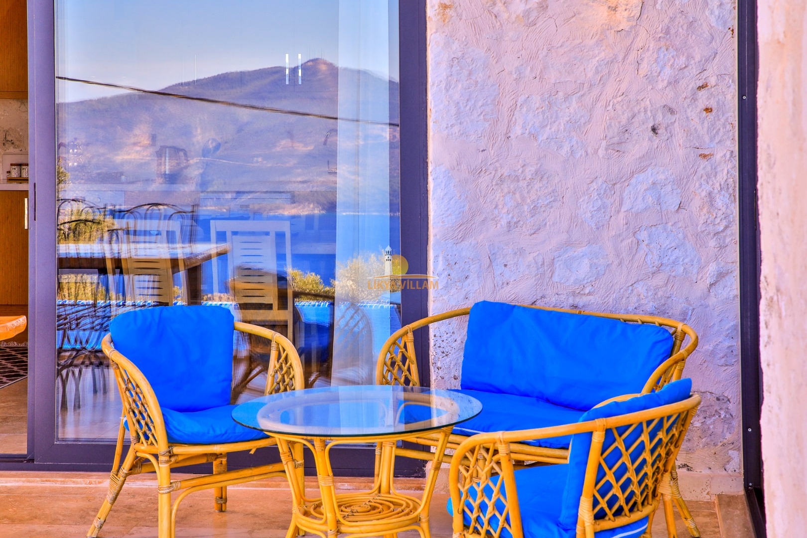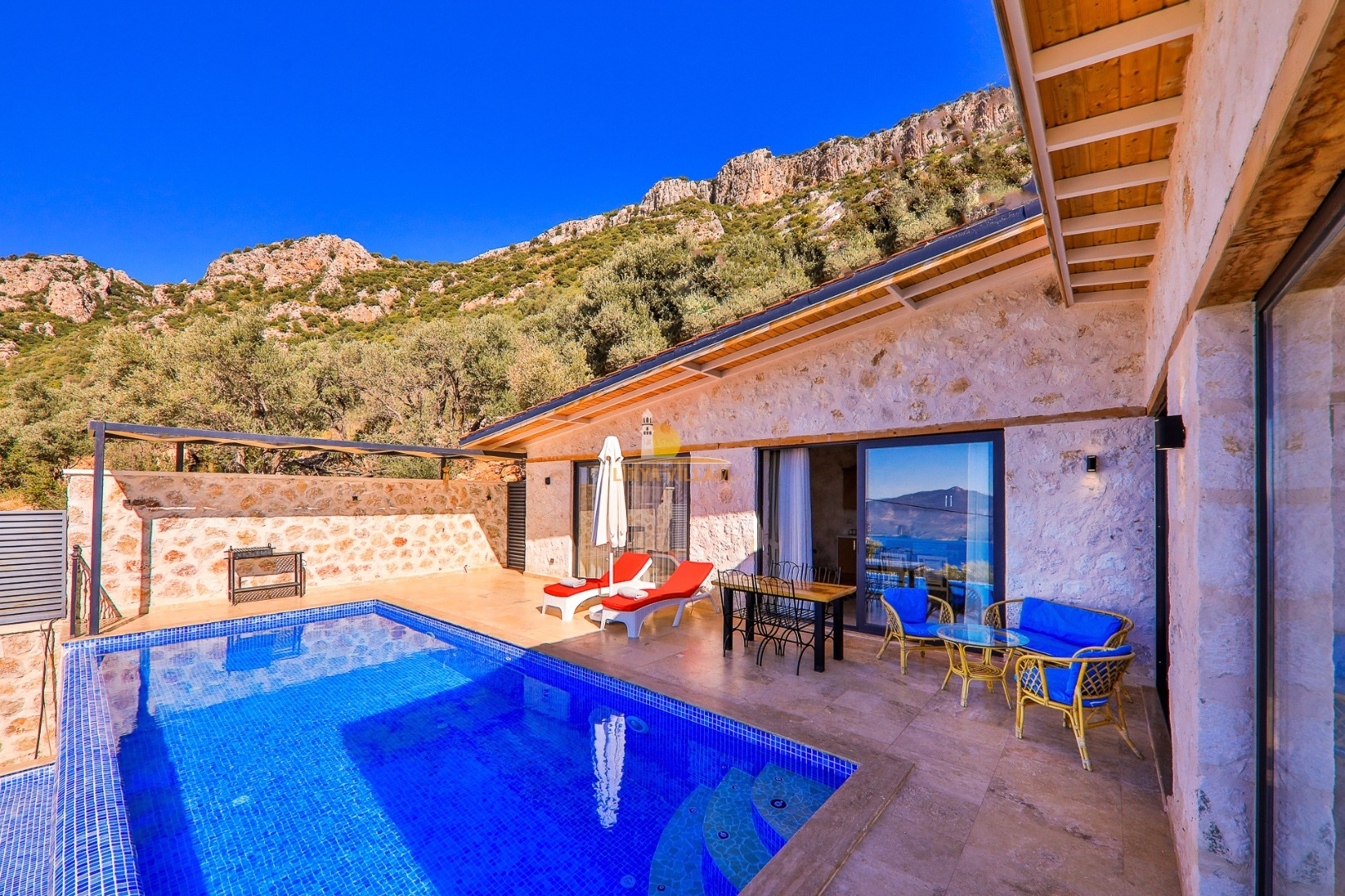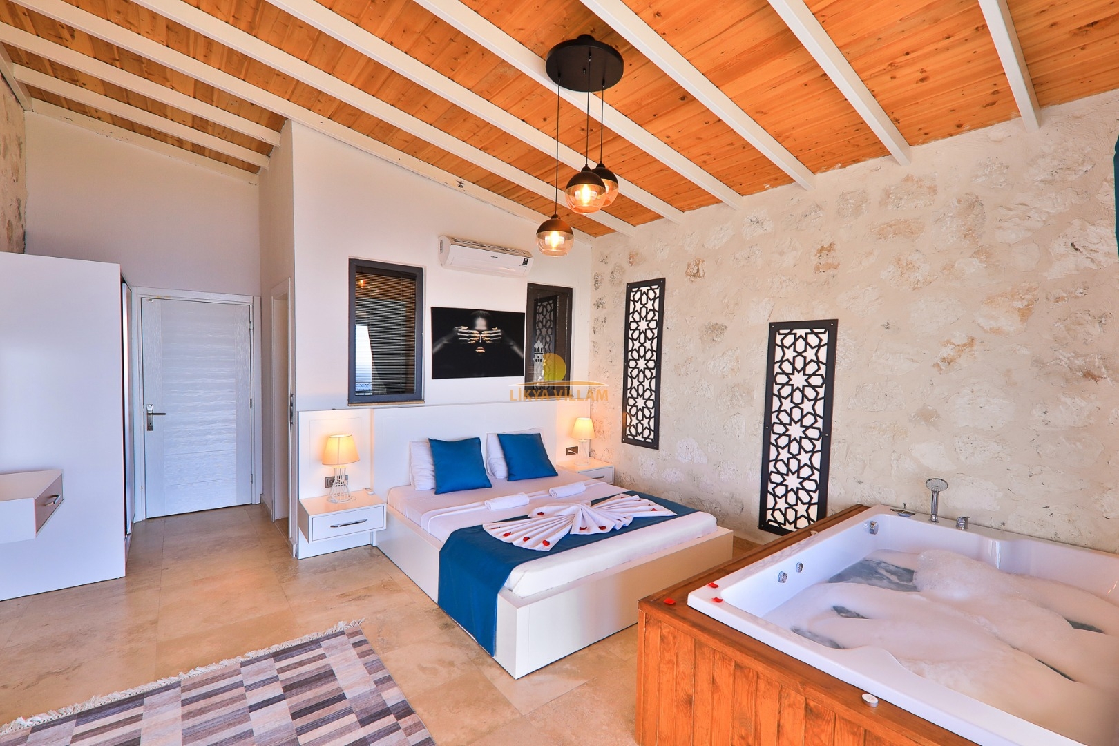 Villa in Kalkan mit Panoramablick, privater Pool, 1 Schlafzimmer, Innenpool, Whirlpool, zentral, ideal für 2 Personen