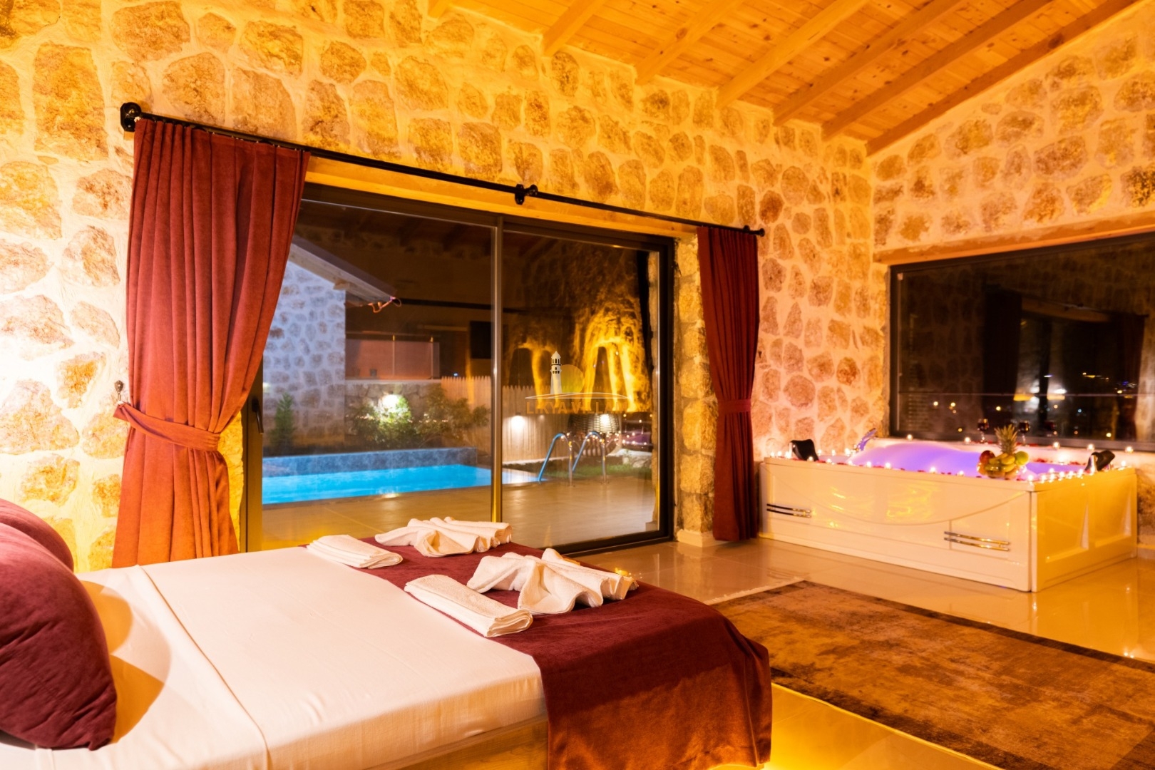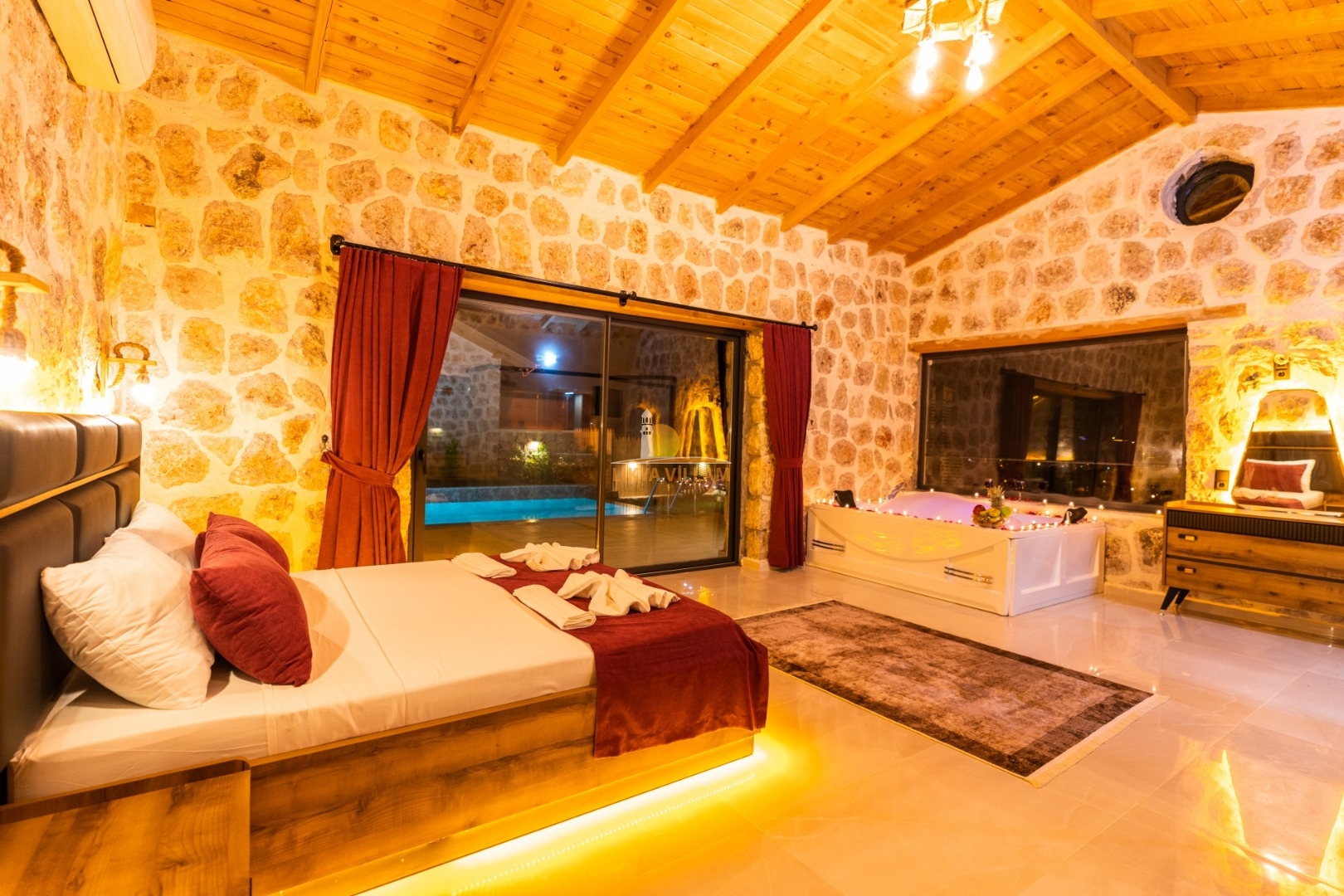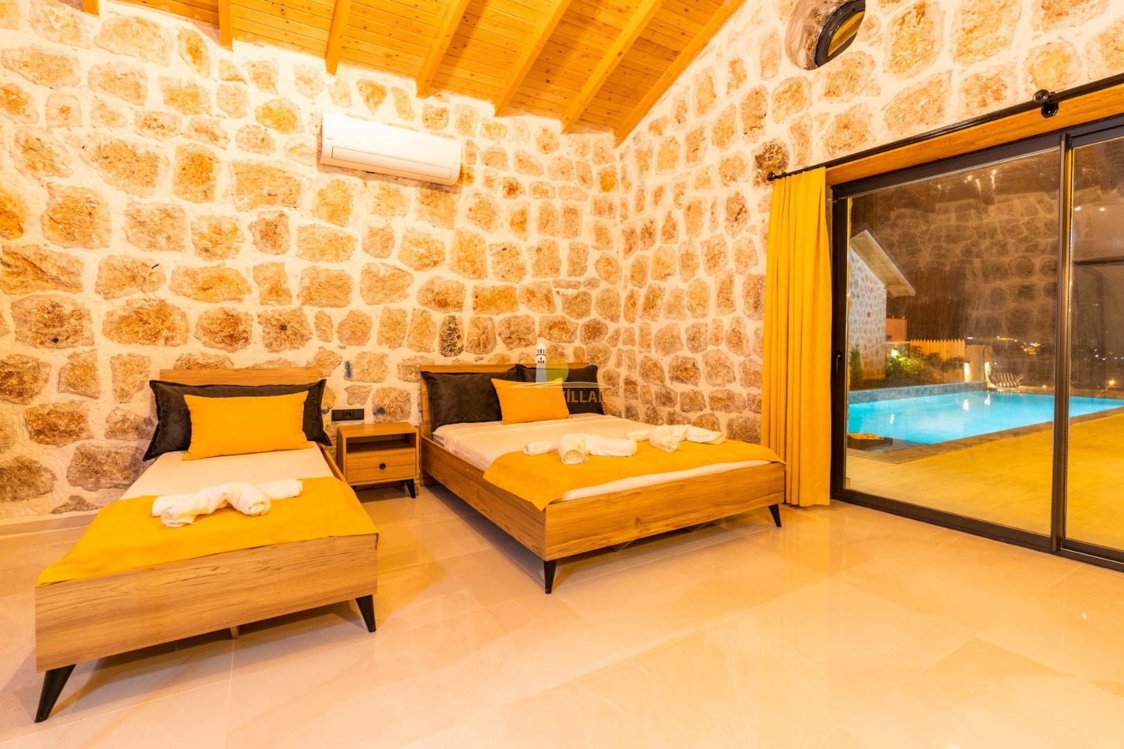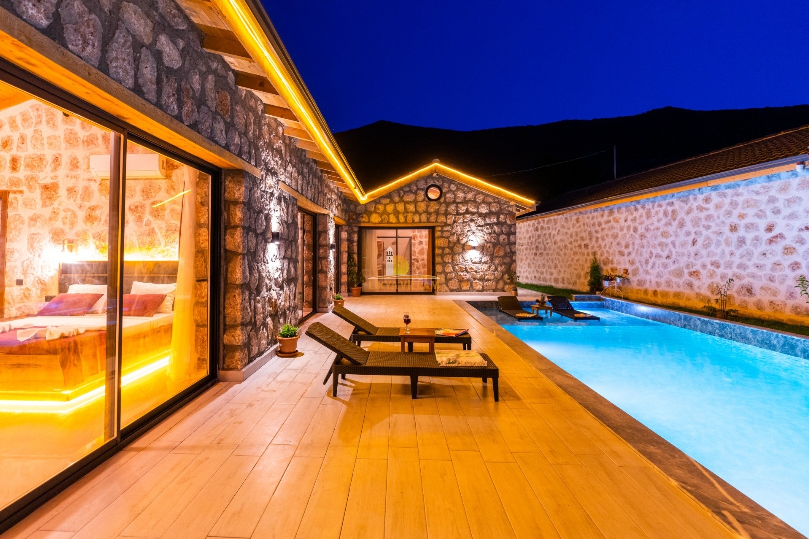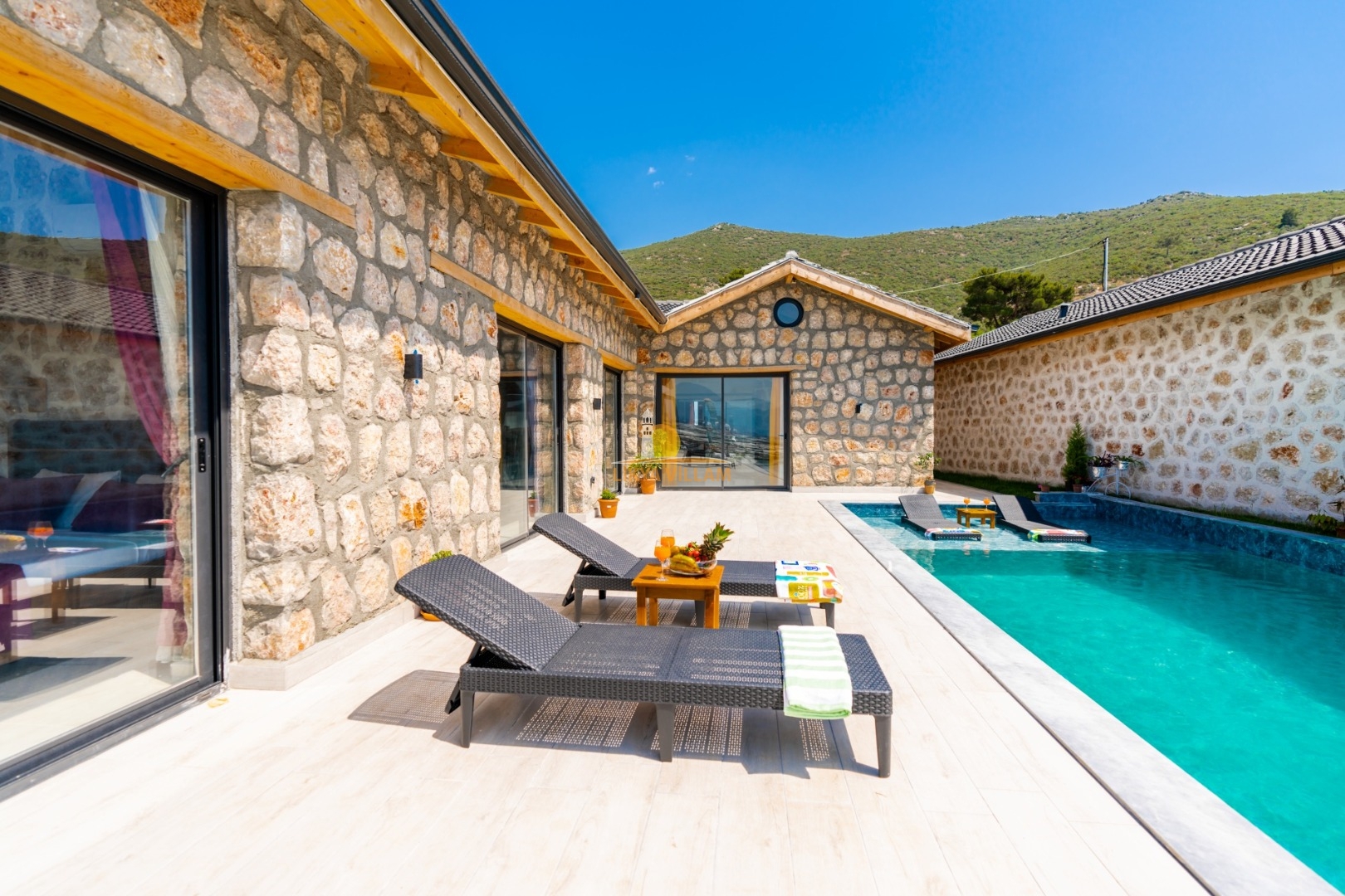Villa mit privatem Pool in Kalkan / Yeşilköy, in moderner Steinarchitektur für 5 Gäste (1 Schlafzimmer mit Doppelbett und Einzelbett.)