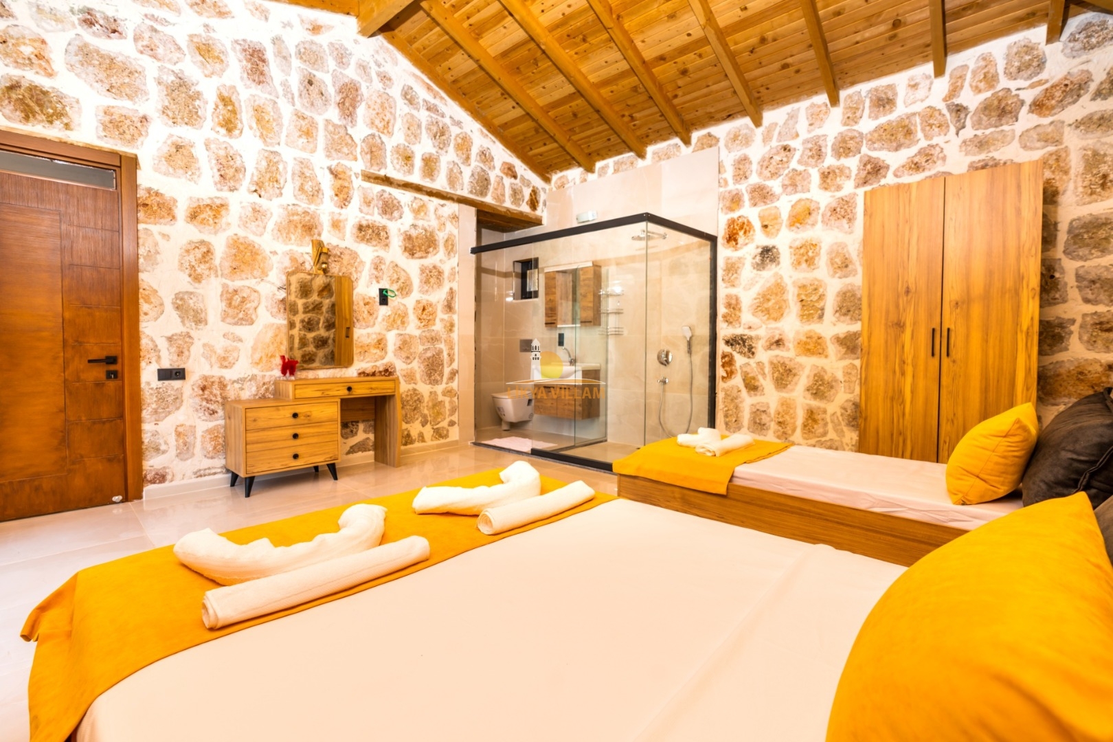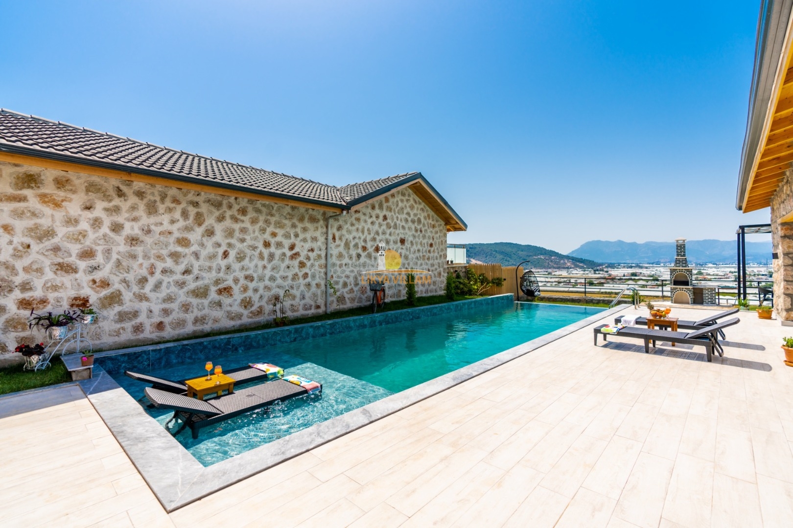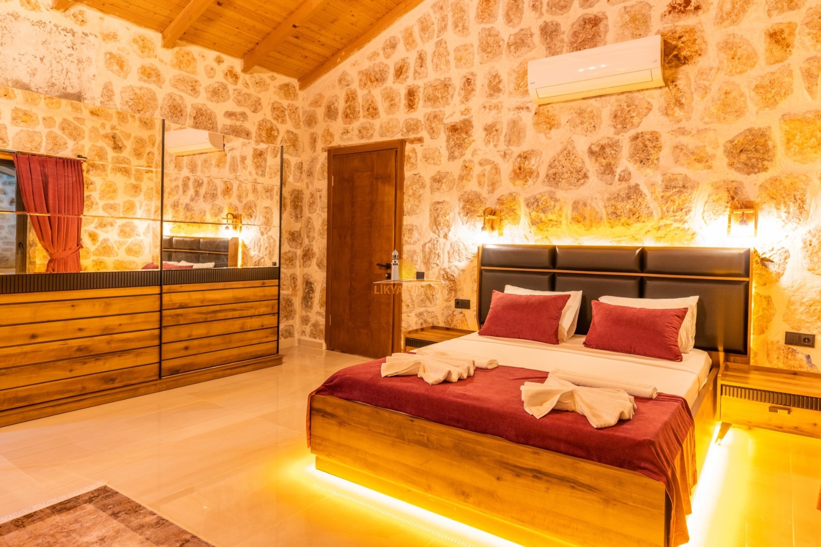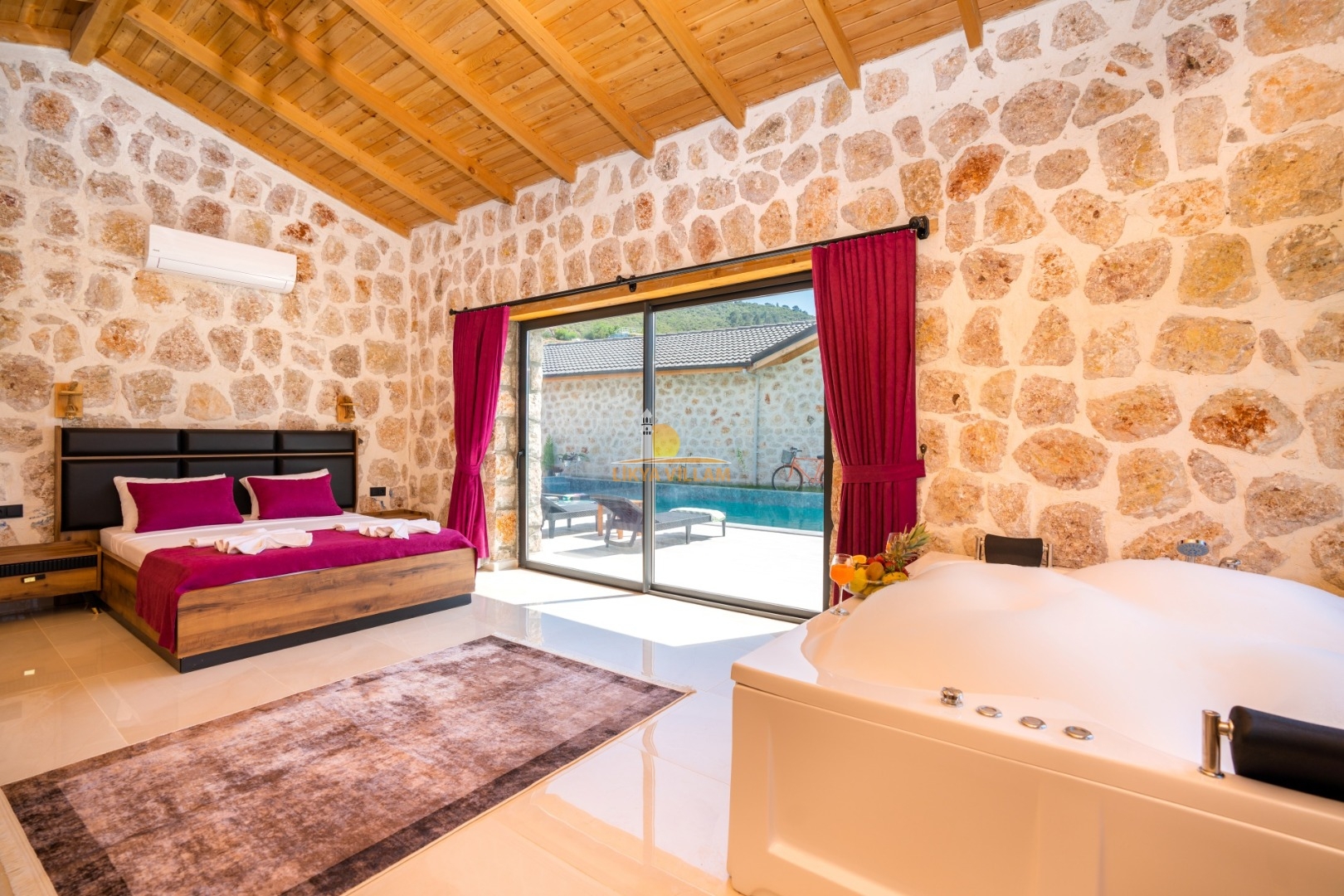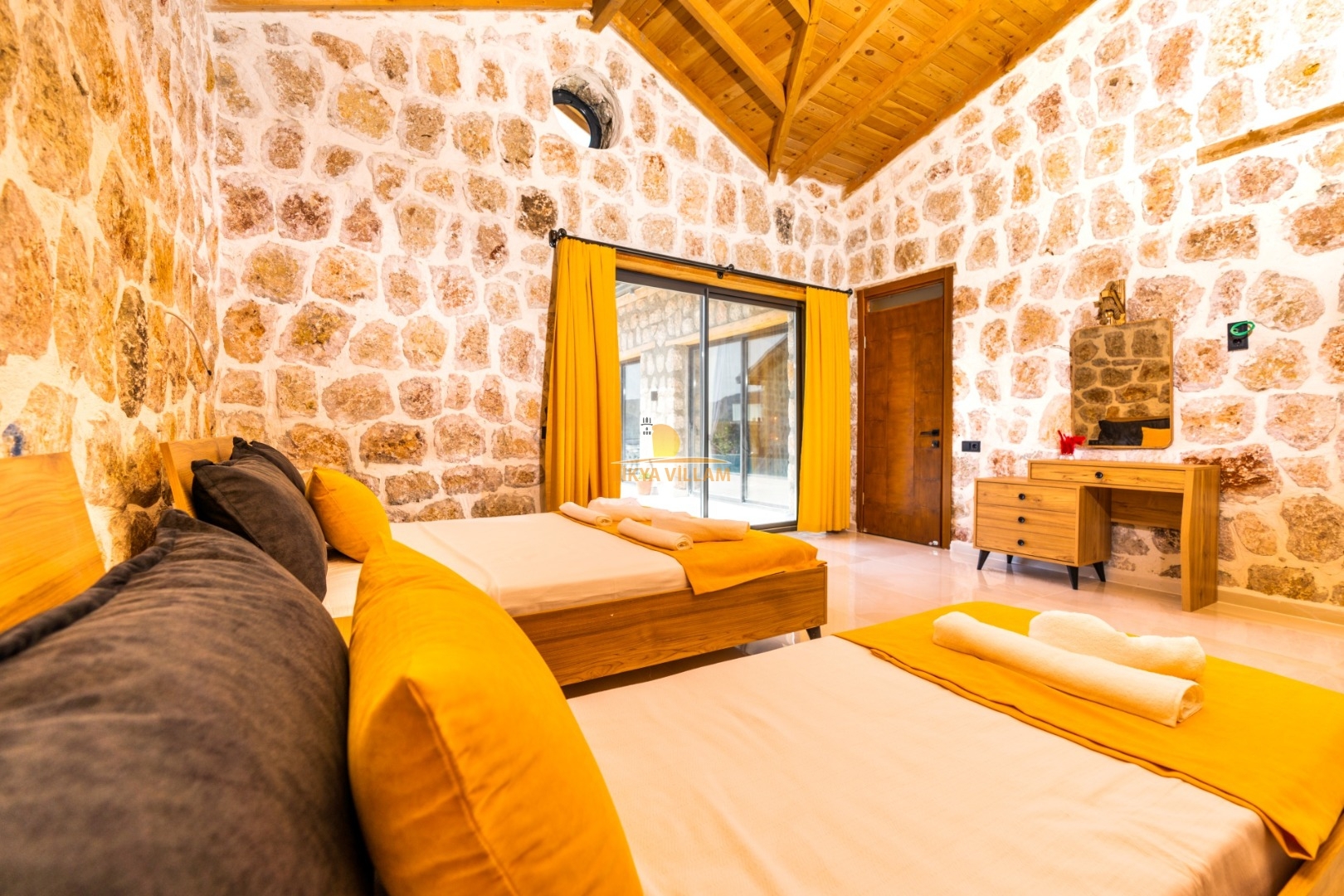 Villa mit privatem Pool in Kalkan / Yeşilköy, in moderner Steinarchitektur für 5 Gäste (1 Schlafzimmer mit Doppelbett und Einzelbett.)