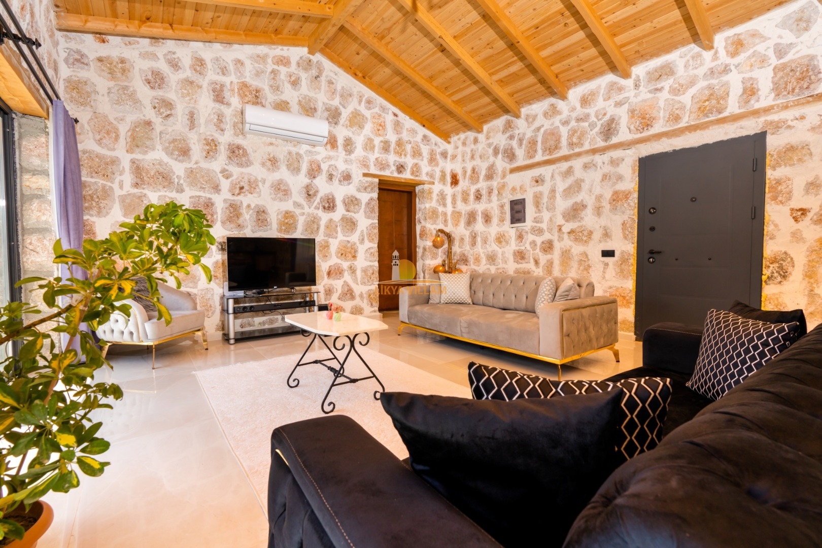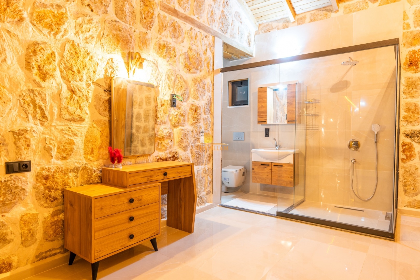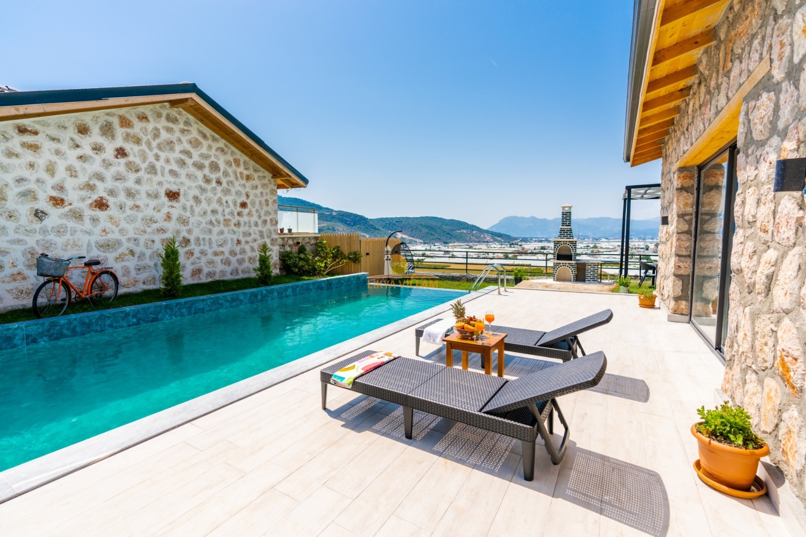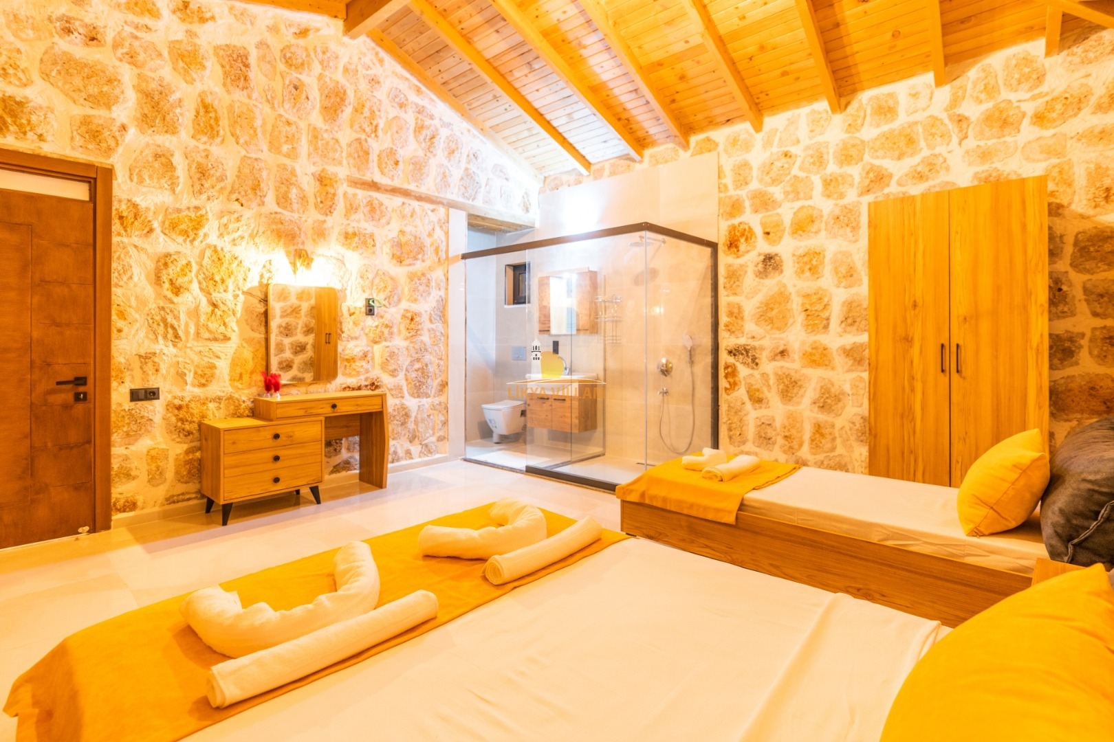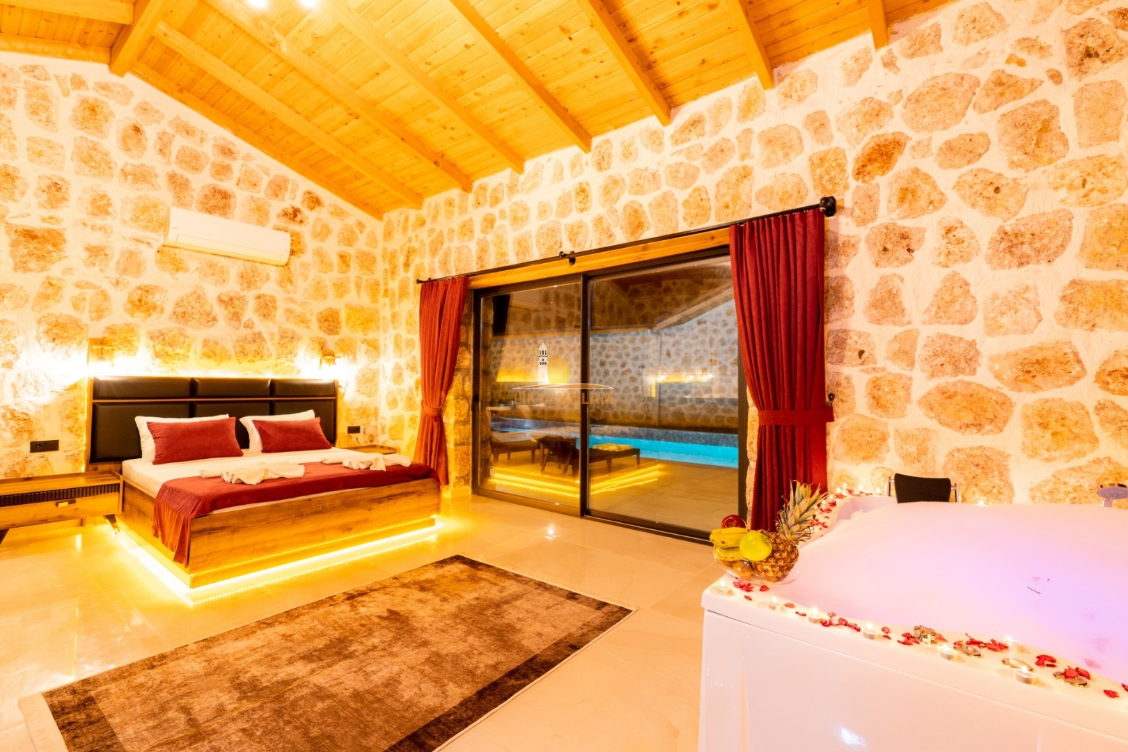 Villa mit privatem Pool in Kalkan / Yeşilköy, in moderner Steinarchitektur für 5 Gäste (1 Schlafzimmer mit Doppelbett und Einzelbett.)