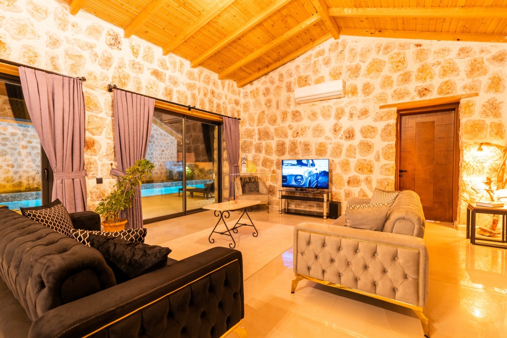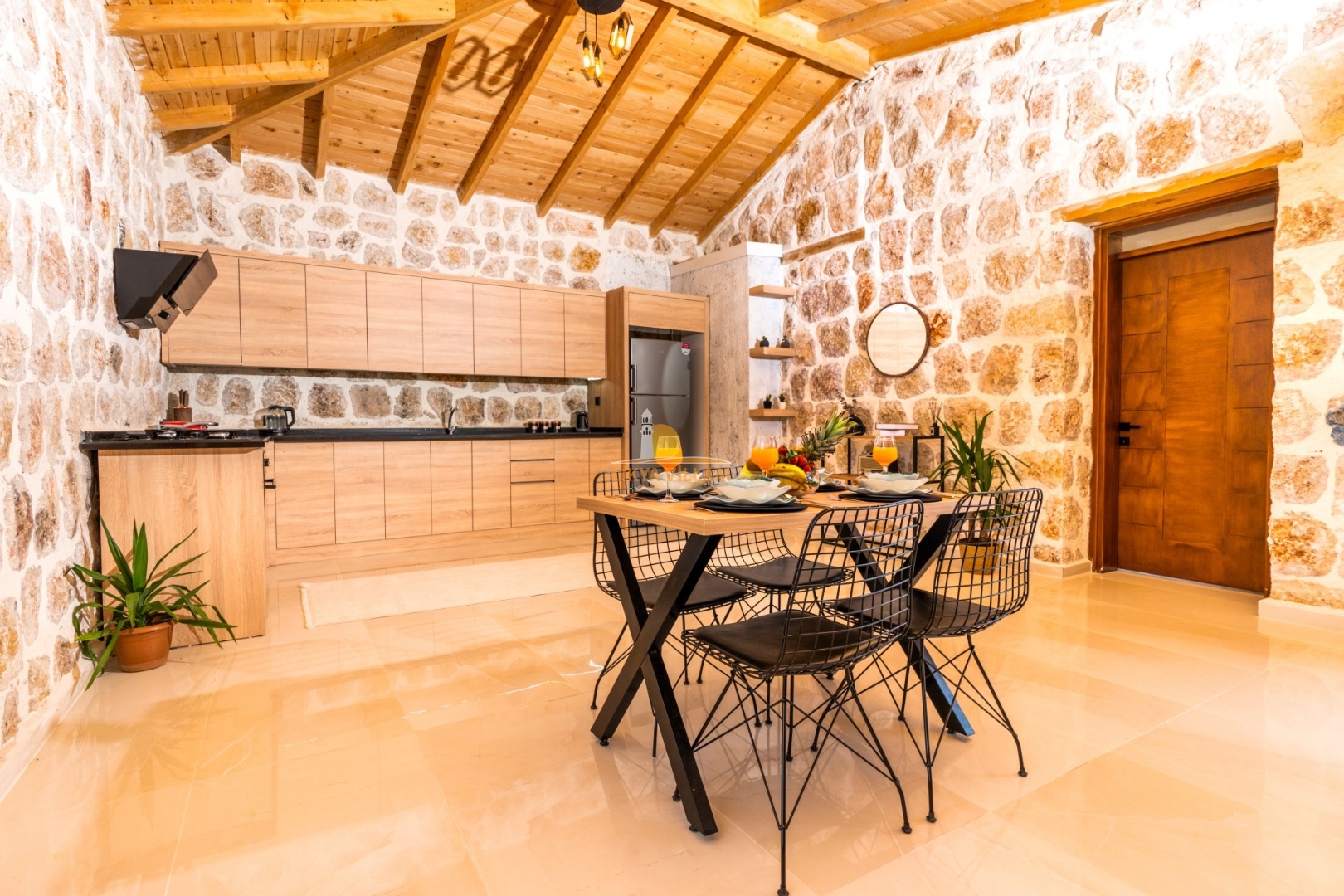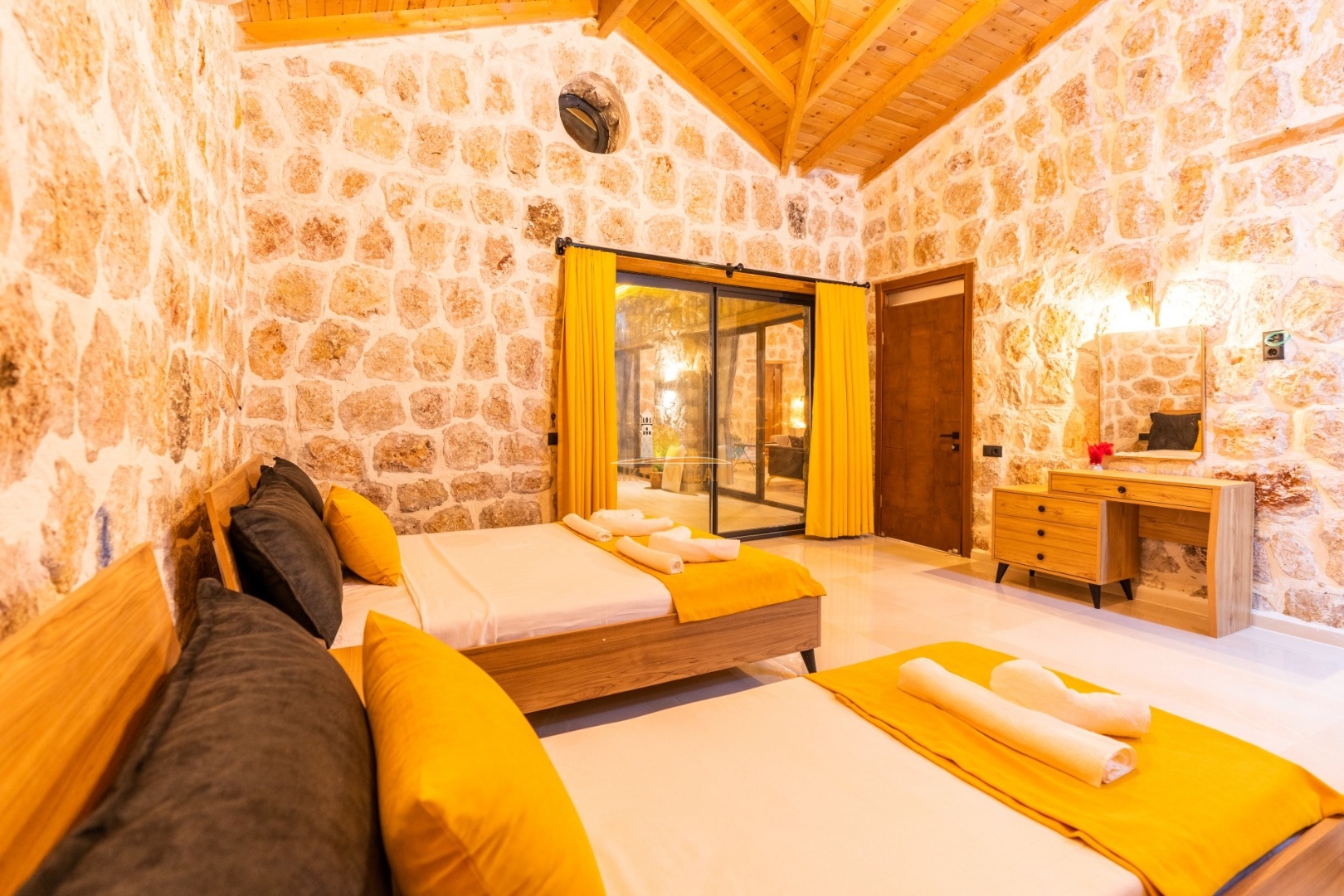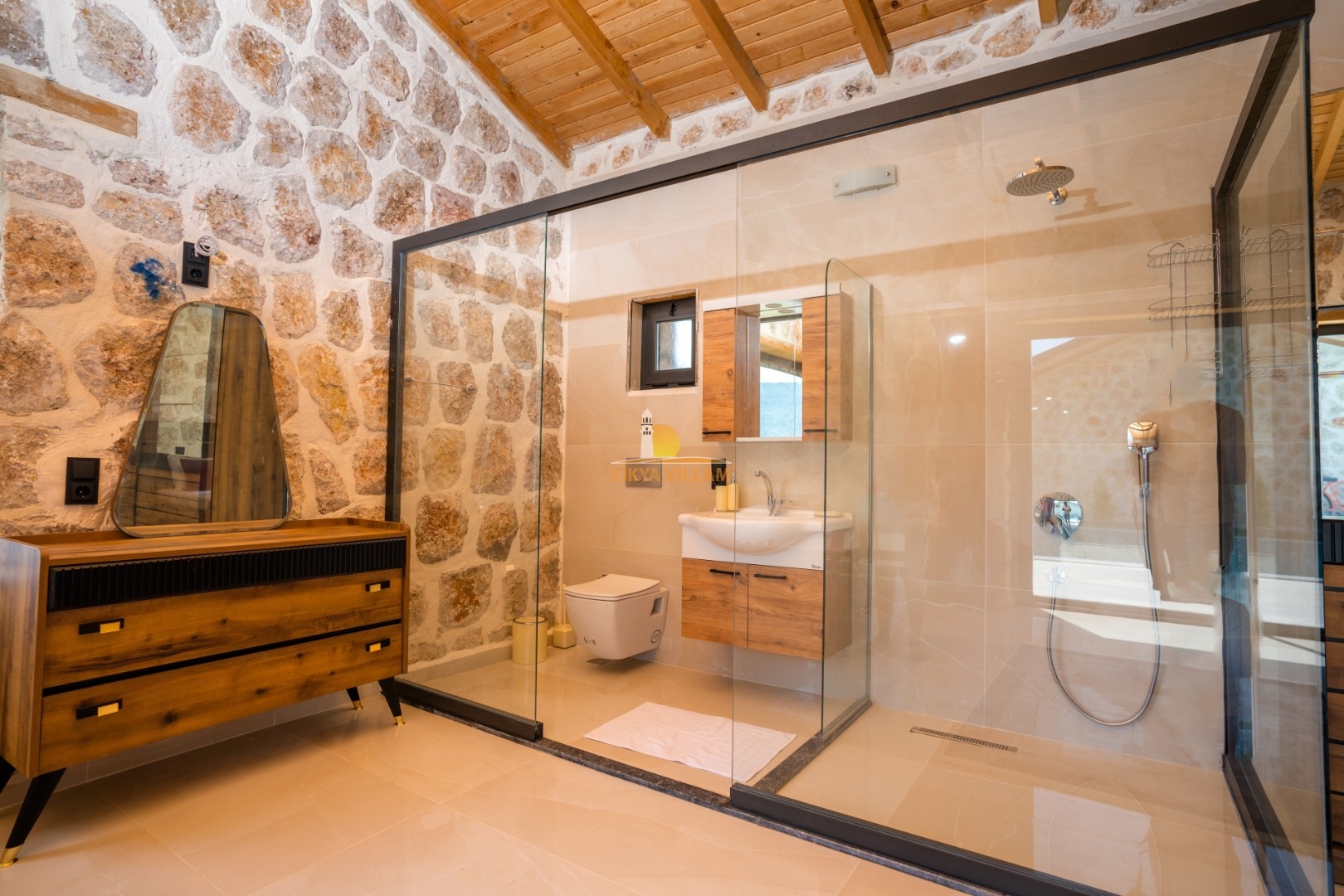 Villa mit privatem Pool in Kalkan / Yeşilköy, in moderner Steinarchitektur für 5 Gäste (1 Schlafzimmer mit Doppelbett und Einzelbett.)