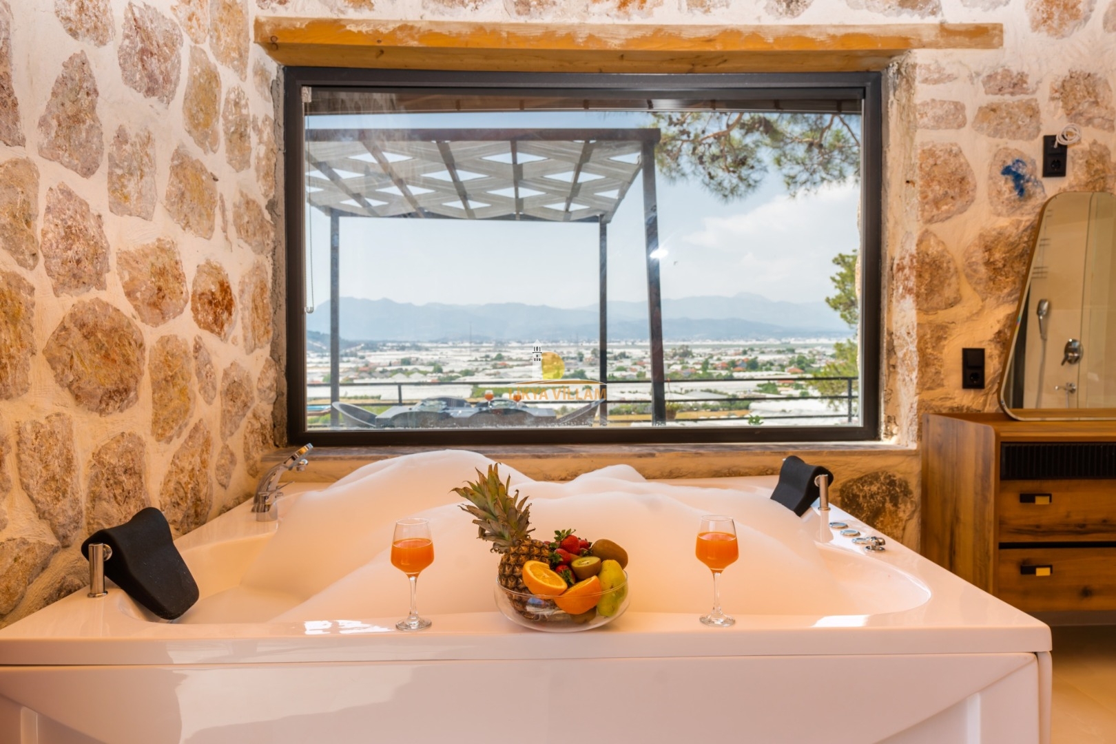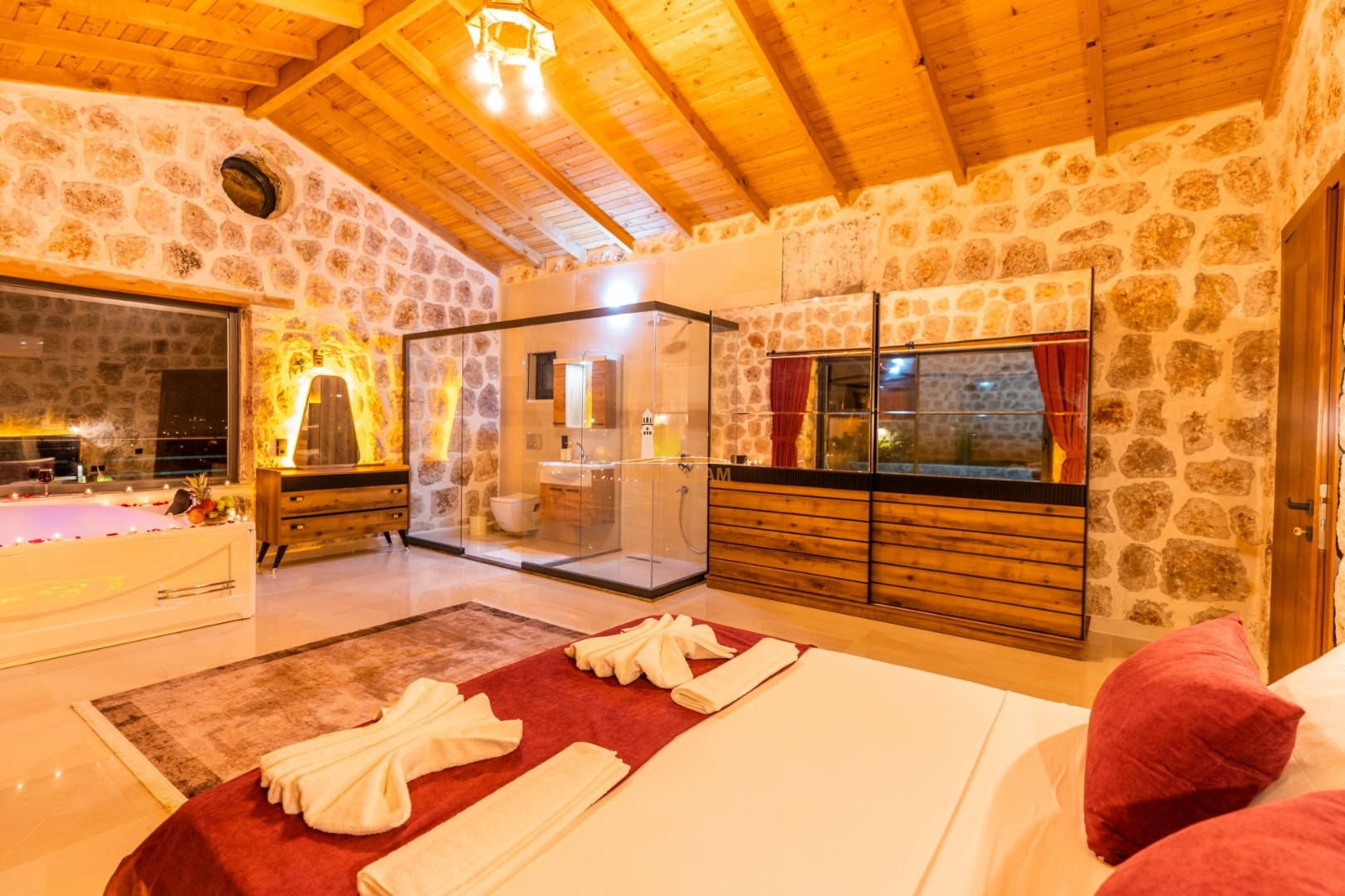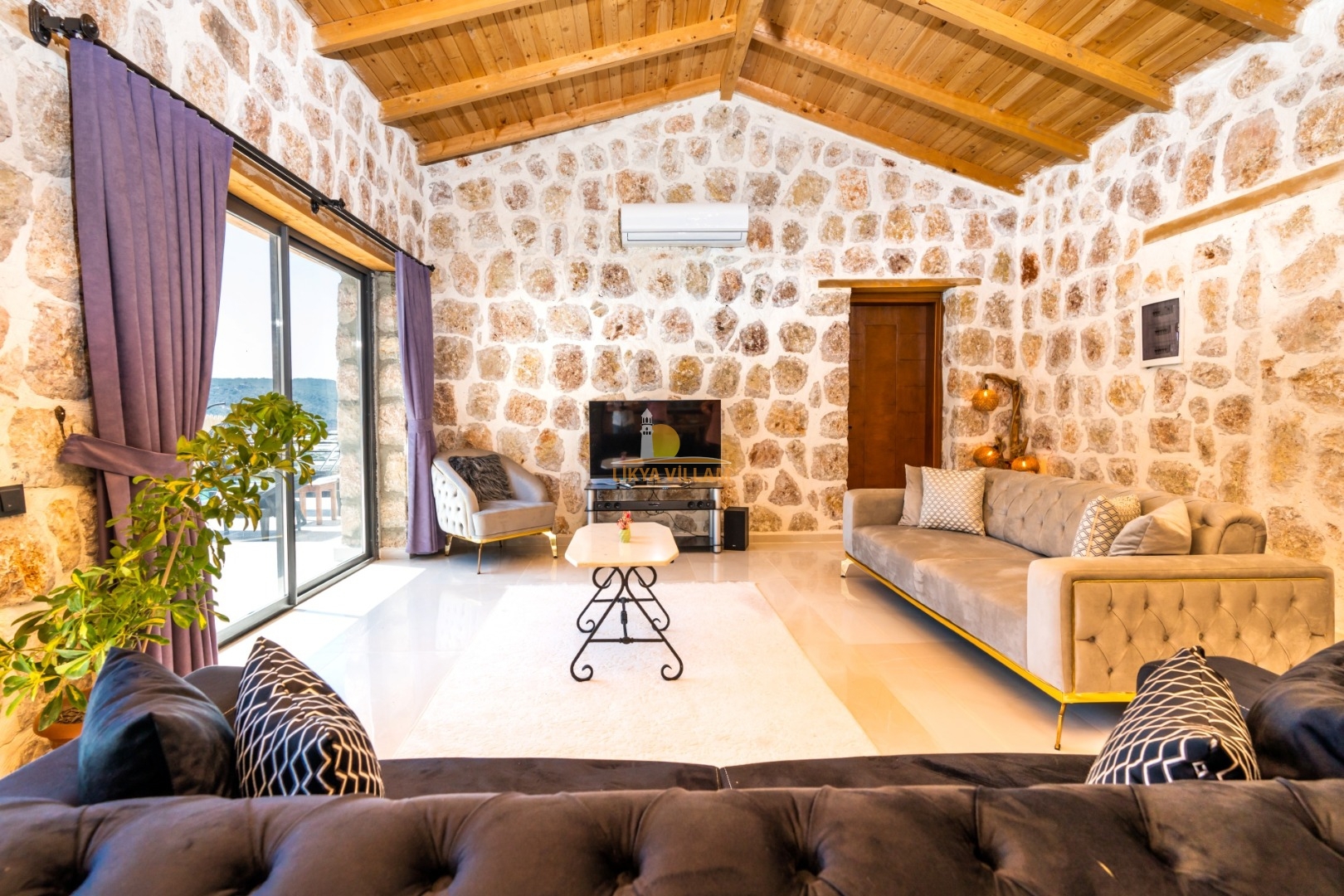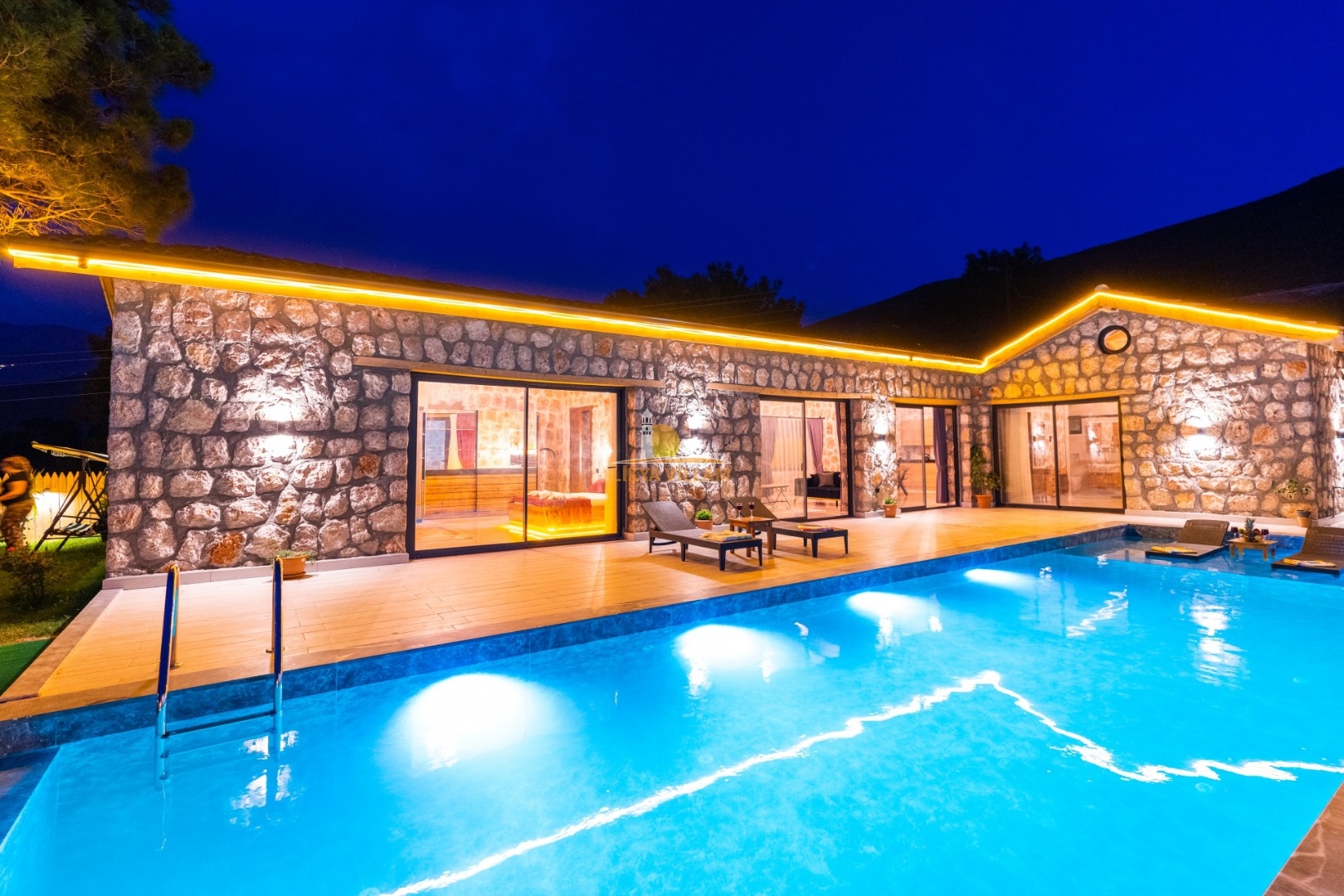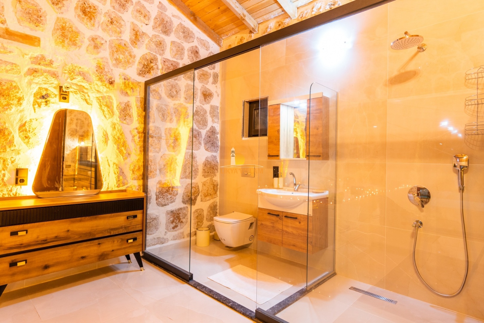 Villa mit privatem Pool in Kalkan / Yeşilköy, in moderner Steinarchitektur für 5 Gäste (1 Schlafzimmer mit Doppelbett und Einzelbett.)
