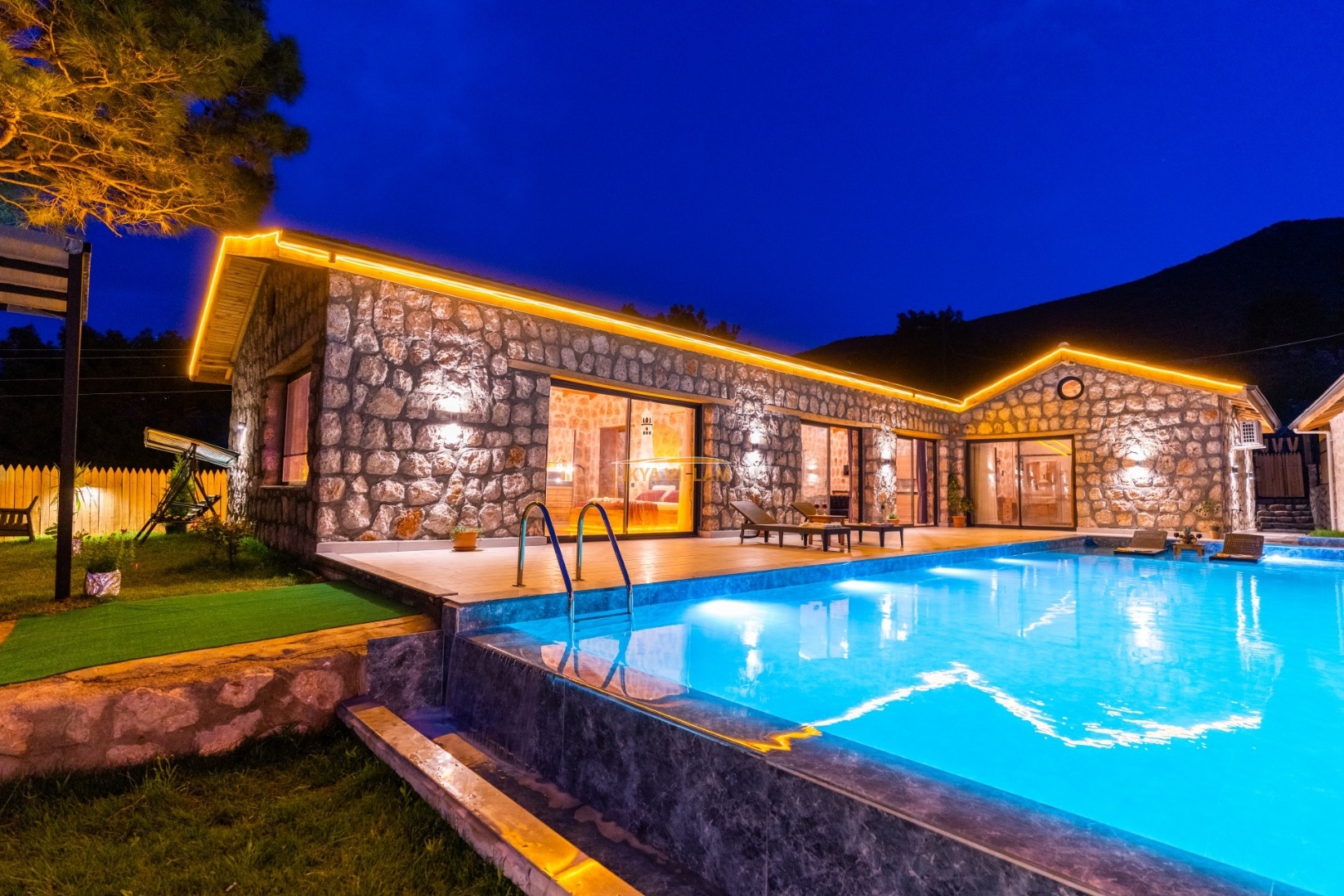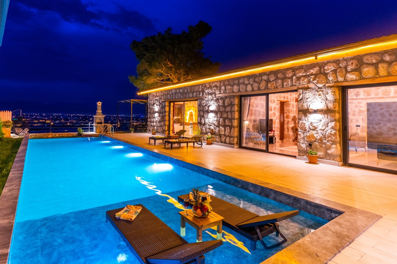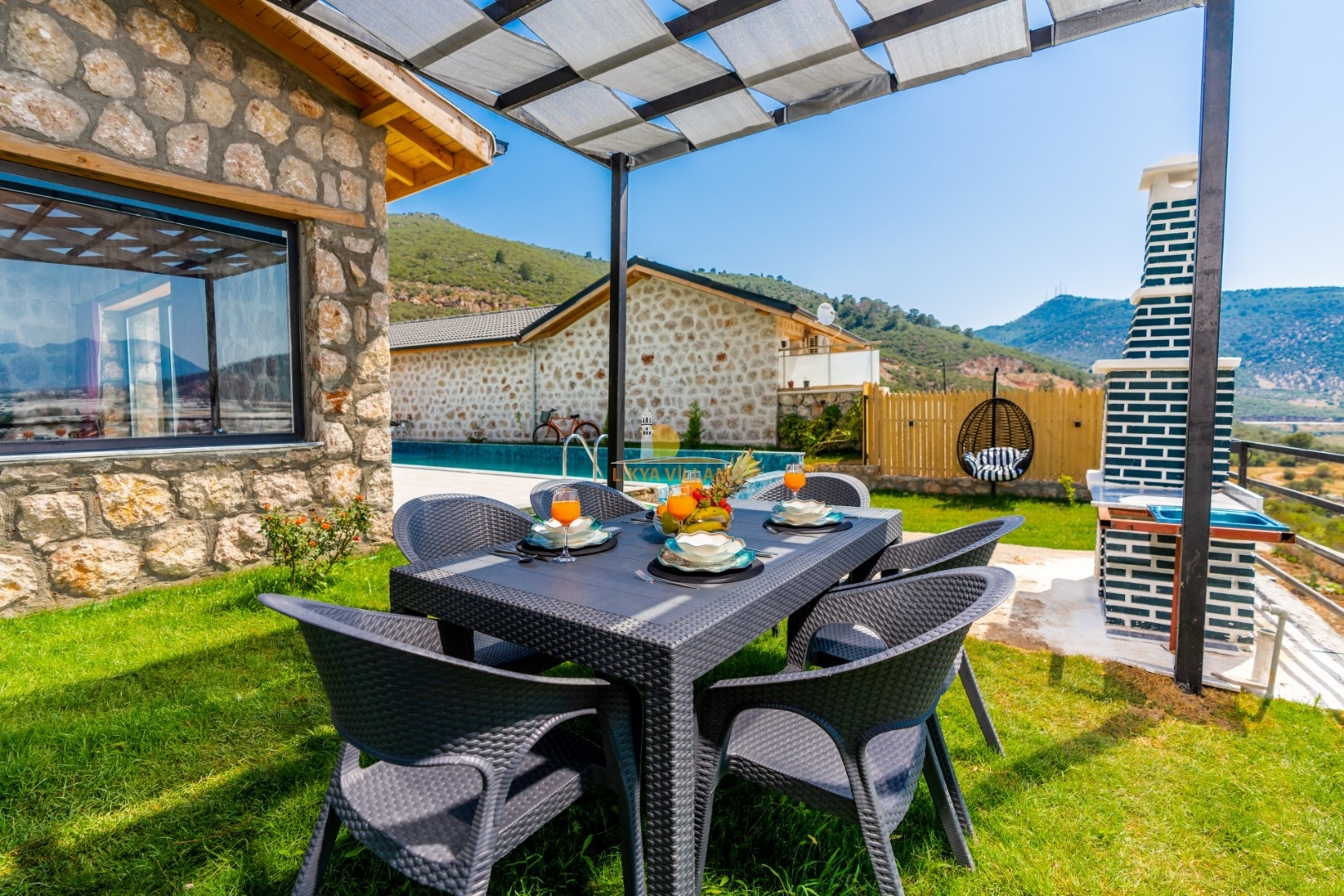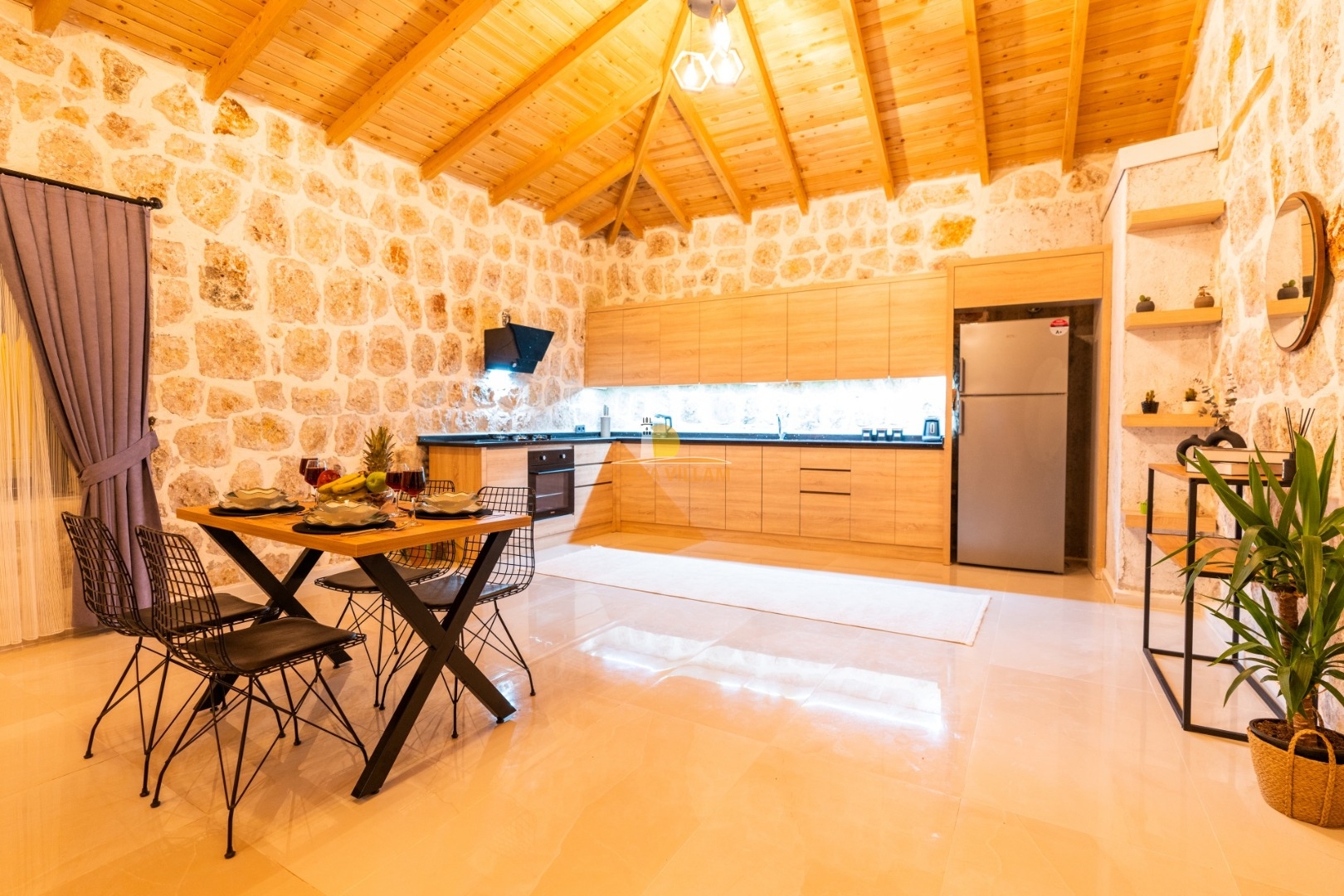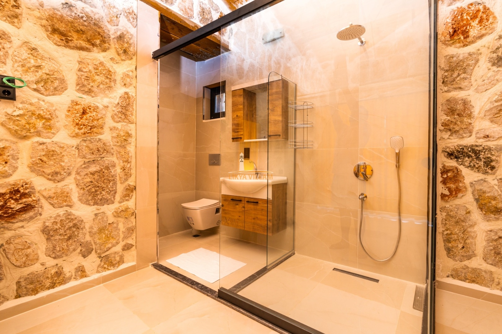 Villa mit privatem Pool in Kalkan / Yeşilköy, in moderner Steinarchitektur für 5 Gäste (1 Schlafzimmer mit Doppelbett und Einzelbett.)