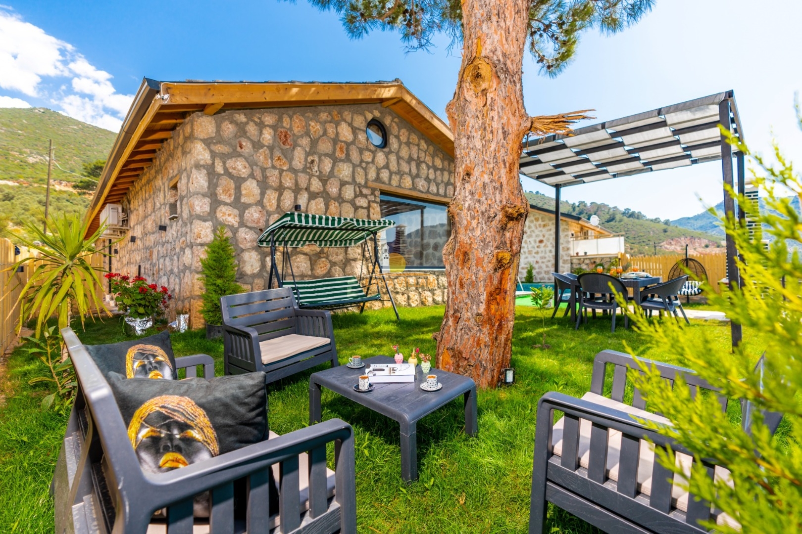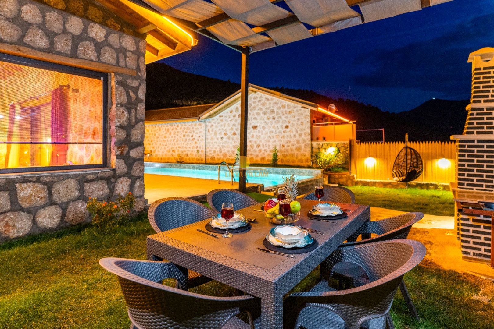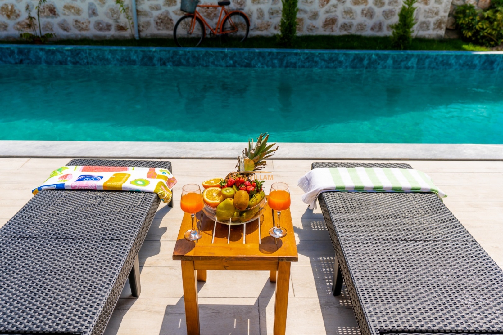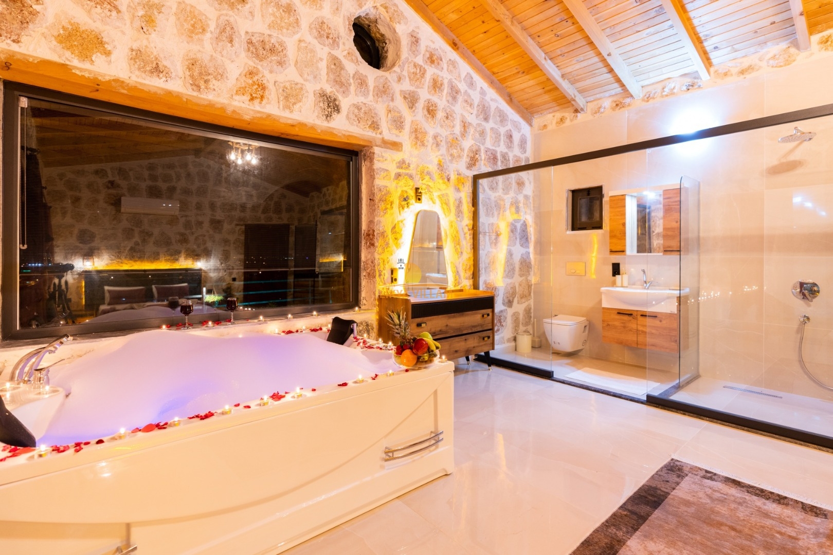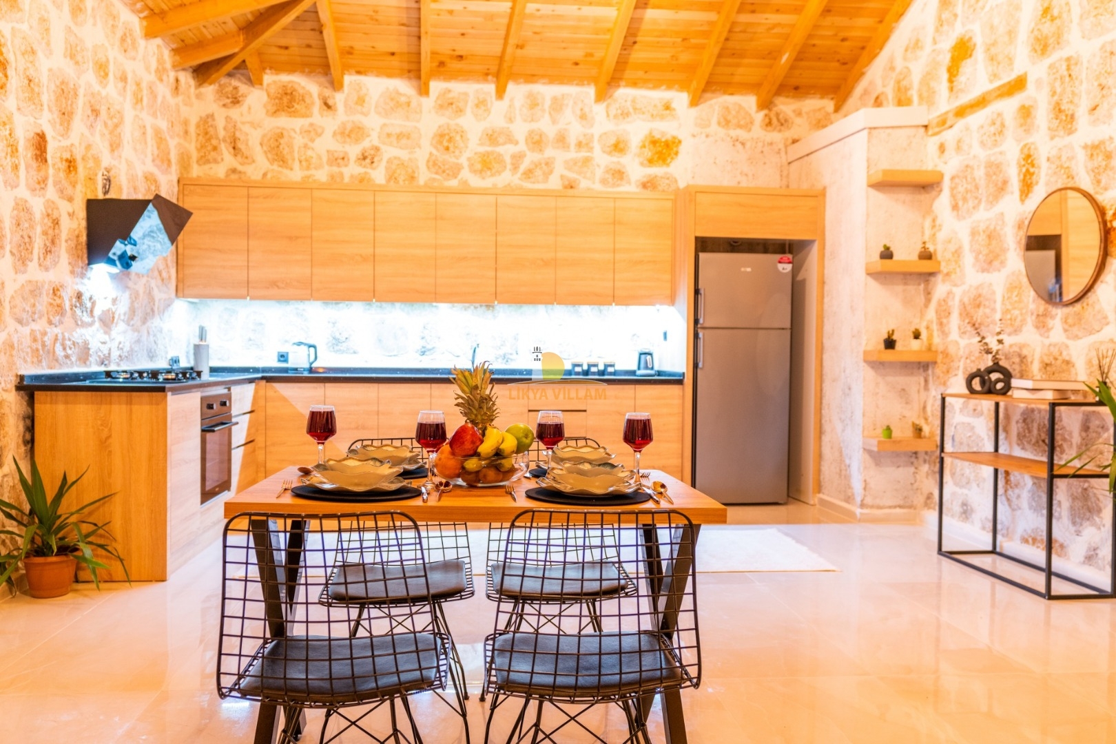 Villa mit privatem Pool in Kalkan / Yeşilköy, in moderner Steinarchitektur für 5 Gäste (1 Schlafzimmer mit Doppelbett und Einzelbett.)