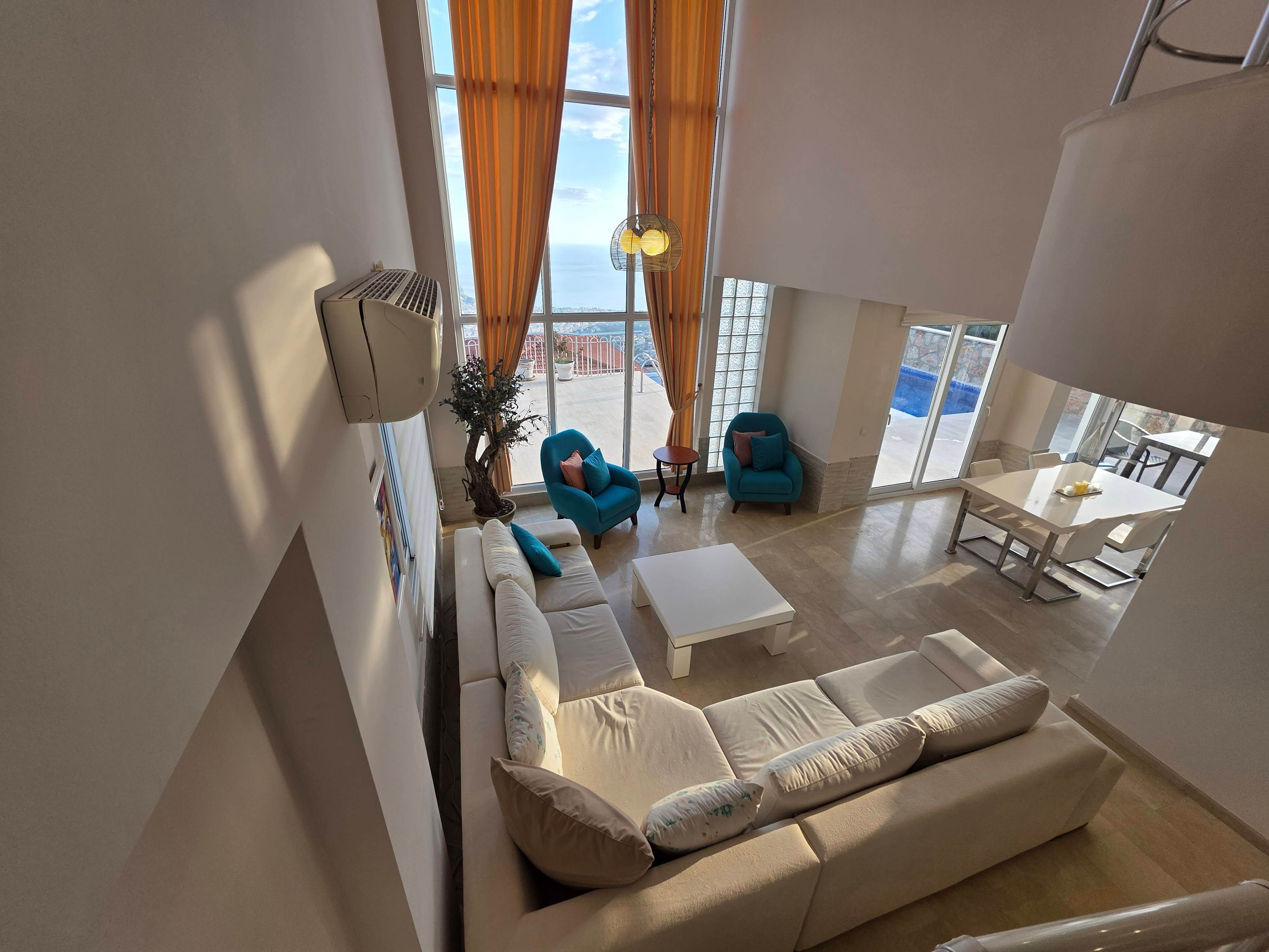 Grosser offener Salon / Wohnzimmer, Balkone + Terrassen mit Meerblick. Master-Schlafzimmer mit eigenem Bad