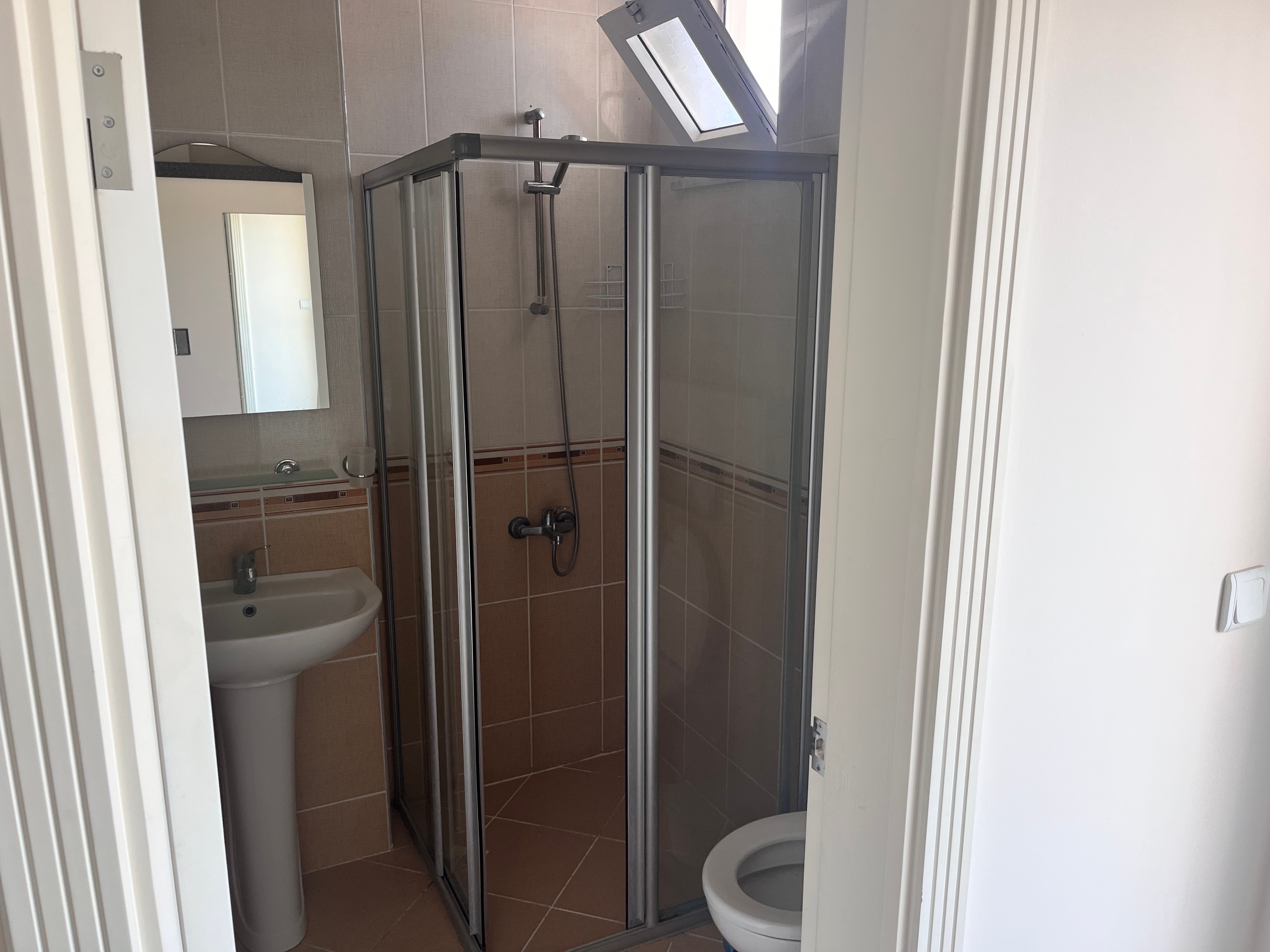 2 Schlafzimmer (Masterschlafzimmer mit eigenem Bad und Zugang zum Balkon) , 2 Bäder, grosser Balkon. Im zweiten Schalfzimmer befindet sich ein Stockbett. Der Aussenbereich ist teilweise überdacht mit teilweise Meerblick sowie Blick auf das Taurusgebirge.