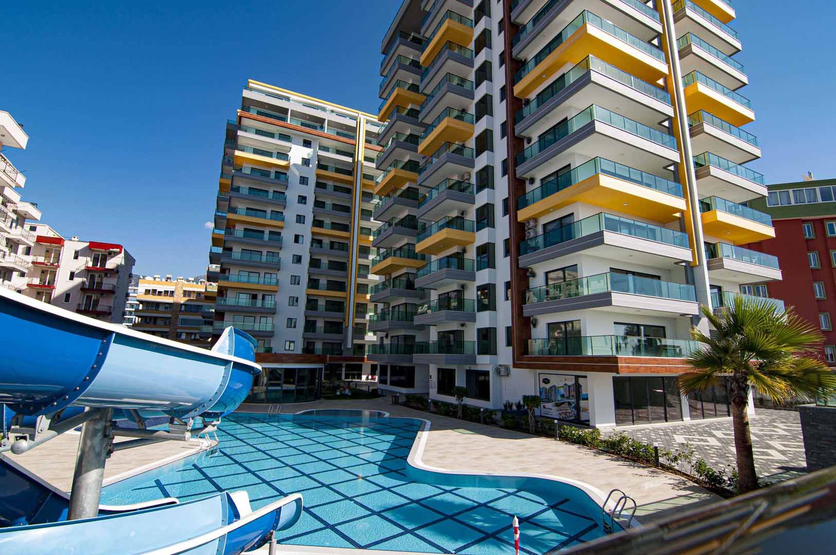 Die 90qm Wohnung mit Meerblick befindet sich in der 11. Etage im exklusiven Kurt Safir Euro 20 Residenz in Alanya / Mahmutlar direkt am Meer.