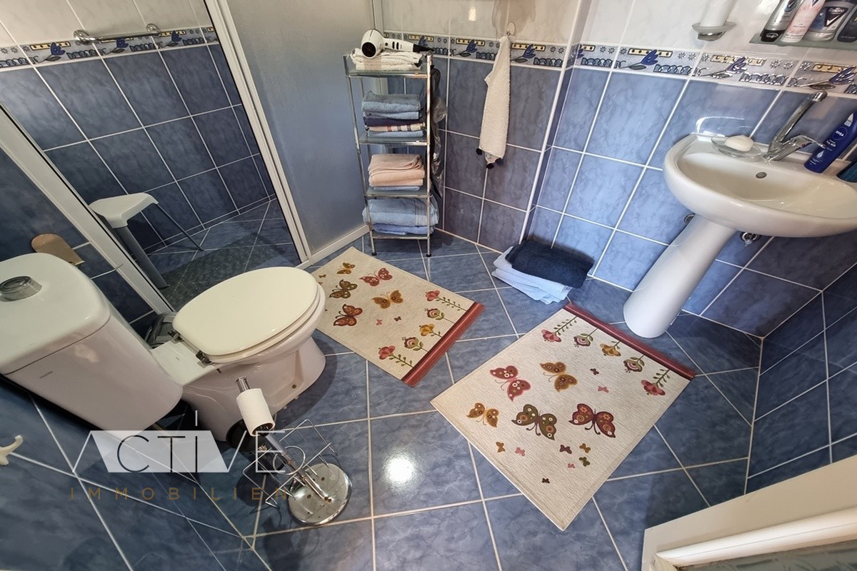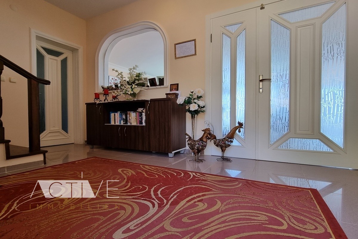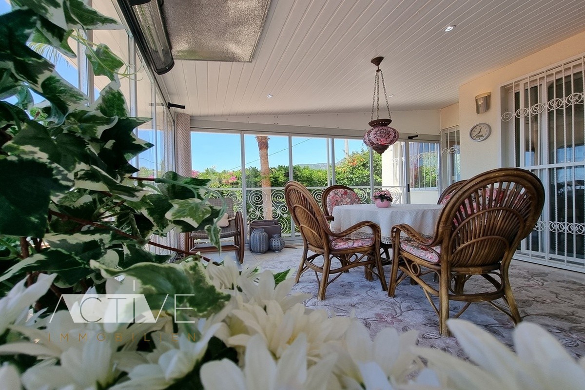 Die Terrasse wurde mit hochwertigen Schiebe-Elemeten verglast, die sich komplett öffnen lassen. So hat man im Sommer eine luftige Terrasse und in der kühleren Jahreszeit einen Wintergarten, in dem sich die Wärme sammelt. Zum Sonnenbaden lädt die Terrasse am Pool, oder der Balkon in der ersten Etage ein. Die Villa wird, wie auf den Bildern zu sehen, komplett eingerichtet verkauft. In den Wintermonaten sorgt ein Kamin oder wahlweise Marmorheizungen für eine wohlige Atmosphäre.