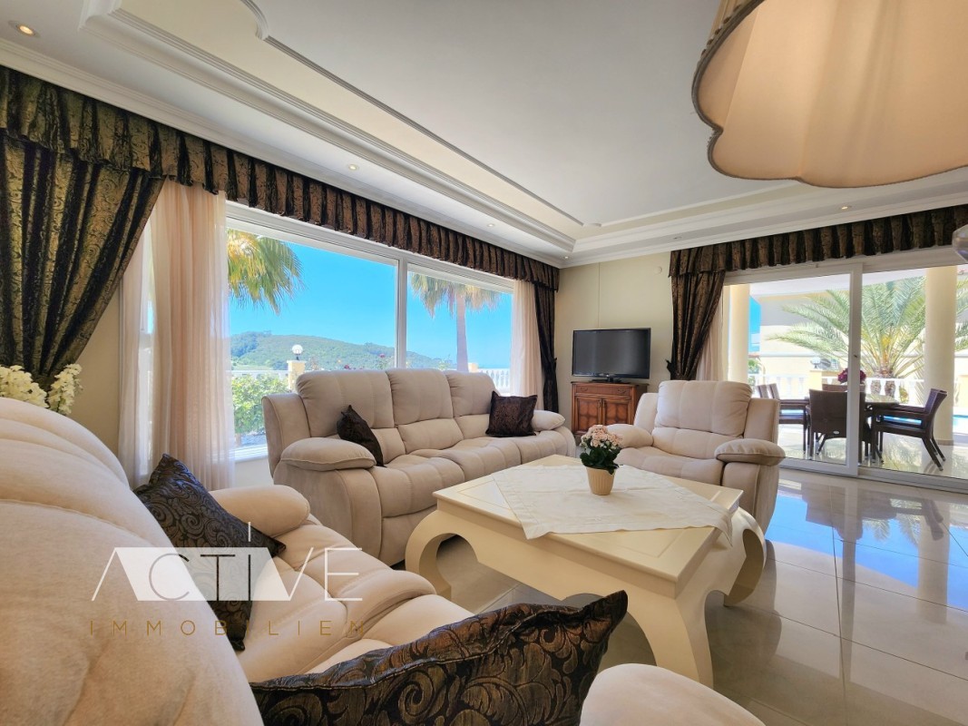 Die Villa bietet Ihnen rundum Komfort. Bei allen Räumen wurde bei der Einrichtung bis auf das letzte Detail Acht gegeben. Die separate Küche ist mit hochwertigen E-Geräten ausgestattet (2 Kühlschränke). In den schönen Stuckverzierungen an den Decken sind Spotlichter integriert. Ein Innenkamin sorgt hier auch an den kühleren Tagen für eine warme und gemütliche Atmosphäre und auch haben Sie Fussbodenheizung. Für die richtigen Temperaturen sorgen die Fußbodenheizung und die Klimageräte. Das Besondere hier ist der riesige Balkon, von dem aus Sie genauso einen atemberaubenden Ausblick auf das Meer und die Berge haben, wie auch von der Terrasse mit dem privaten Pool! Auch von Innen können Sie die Aussicht natürlich ungestört genießen.